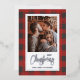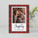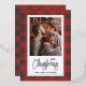 Red and grey buffalo check greeting card features your names, Merry Christmas and your favourite photo bordered in real silver foil. Select Matte for heaviest paper and high definition for best print quality.