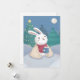 A cute illustration of a bunny with a blanket in front of decorated trees
