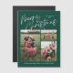 Green Merry Christmas Calligraphy Photo Magnetic Card features modern calligrapy script on the front, along with three photos, and a festive Christmas plaid on the back.
