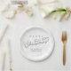 This design features a merry Christmas cute calligraphy script paper plate with an elegant silver snowflake pattern, with a winter snow elegance whimsical, stylish trendy calligraphy script font, a minimalist minimal white lettering, a Christmas holiday wrapping supplies, custom customised gift message greeting, silver calligraphy script grey text, Christmas holiday party supplies, Christmas disposable paper supplies