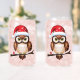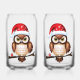 This charming design features a detailed illustration of a brown and white owl perched on a branch. The owl wears a red Christmas hat sprinkled with white snowflakes, adding to the festive spirit. Its large captivating eyes draw attention, while a small red gift with a white ribbon subtly rests at the base of the branch, suggesting the generous nature of the holiday season. This design captures the warmth and joy of Christmas through the representation of this iconic winter bird in a cozy and celebratory setting.