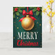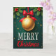 Below the ornament, the words "MERRY Christmas" are elegantly displayed. "MERRY" is in a crisp white font, while "Christmas" is written in a flowing red script. This contrast adds energy to the message and blends elegance with joy. The colors of gold, red, and green create a festive feel, enhanced by soft lighting that highlights each detail.