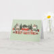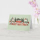 Vintage style Merry Christmas Card with cars and trees, and Merry Christmas in reds on light rustic green background