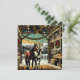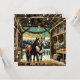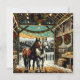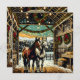 Pretty Christmas card with the graphics of two horses standing in a barn decorated in holiday wreathes and pretty twinkling Christmas lights. These horses are done in a cartoon comic book pop art style.
