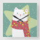A cute illustration of a cat wearing a red scarf and wrapped in Christmas lights
