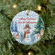 This custom Christmas ornament features an old-fashioned scene of a snowy village, towering Evergreen trees, a charming village, and a whimsical snowman. The snowman, with his red-and-green striped carf, carrot nose,and top hat, look as if he was constructed from faux embroidery. Text at the top if fully customisable, so make sure to customise it with your name and/or other message.