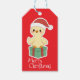“A cute, cartoon chicken wearing a cozy red Santa hat, happily perched on top of a beautifully wrapped Christmas gift. With soft festive colors and a playful holiday charm, this cheerful little chicken brings a warm, whimsical touch to the gift tag.”