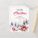 Merry Christmas classic traditional red baubles and red ribbon snowy fir trees watercolor postcard