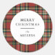 Share holiday cheer with this personalised Merry Christmas round sticker featuring a classic red plaid pattern. This festive sticker highlights your family name beneath a cheerful holiday greeting for a warm, personal touch.