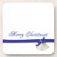 Merry Christmas drink coasters in blue and white text on a white background. A blue ribbon with white bells and a blue bow runs across the design. Very festive Christmas design for all your holiday items.