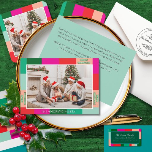 Capture the spirit of the holiday season with our distinctive Christmas Greeting Card. This card boasts a vibrant colour block frame that elegantly combines greens, pinks, and red, setting a festive stage for your cherished memories. The front of the card is designed to feature 1 photo, allowing you to personalise it with a moment that holds special meaning. Wrapped in stylised text, your message of warmth and joy will be beautifully displayed, making a lasting impression. You choose the photo, ensuring that each card is a unique reflection of your holiday cheer. This isn’t just a greeting card; it’s a cherished memory preserved in a collage of festive hues and heartfelt words. Share the magic of the season with this bespoke creation that speaks volumes with personalisation and style.