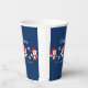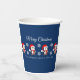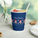 Christmas paper cup with penguins and snowflakes on a blue background.