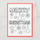 "Merry Christmas" big letter typography for colouring page with fun dangling ornaments, tree shapes, holly, and stars. Can be mailed or hung as wall art on fridge. Great entertainment activity for children as party favours, teachers for student activity, or sending to the grandparents from child. This card has a red border.