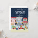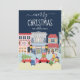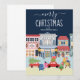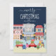 Cosy street scene shows shops and a theatre decorated for christmas. There are pedestrians carrying Christmas presents and two red cards parked along the street. One has a Christmas tree and the other has presents on the top. Merry Christmas is written in trendy typography.
