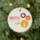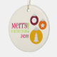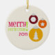 A Christmas ornament featuring an illustration of three ornaments decorated with a snowflake, a Christmas tree, and a star. Text "Merry Christmas" at left. Personalise with the year. Design has a pink, green, burgundy, orange, and yellow colour scheme.