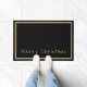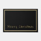 Doormat shown with a black background, silver-coloured and gold-coloured borders surrounding the doormat and phrase of "Merry Christmas" in a upbeat text in gold-coloured near bottom of doormat.