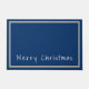 Door mat shown with a deep blue background, white and gold-coloured borders surrounding the doormat and phrase of "Merry Christmas" in a upbeat text in white near bottom of doormat.