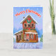 A nice warm welcoming home on a ranch. A dog on the porch with Christmas lights and snow covering the farm house.