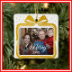 Merry Christmas photo ornament, elegant bow ceramic, gold present ornament, luxe personalised keepsake, picture collage ornament, family photo Christmas, chic collage ornament, custom holiday photo, gold Christmas ornament, bow photo ornament