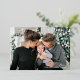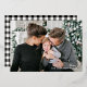 Photo card features an elegant real rose gold foil "Merry Christmas" calligraphy script overlay design with custom white text that can be personalized with your name(s), the year, and a favorite landscape style photo. The back of the card includes a trendy yet classic black and white buffalo plaid pattern. Photo credit: Sunbeam Photography www.facebook.com/SunbeamPhotography