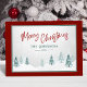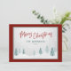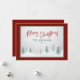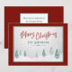 Elegant country holiday flat cards with "Merry Christmas" in red coloured, handwritten style calligraphy along with your personalised family name or names and the year in a blue spruce pine coloured, rustic style typography. An artistic scenic view of trees and winter snow highlights the front of the card accented in a pleasant, red & pine green frame. The back of the card, also in pine green, features a text space for your personal holiday message or can be left blank for you to handwrite one if needed. Available in high quality printed card stock for standard mailing or a downloadable, digital format for quick and easy sending via text message, email or even self print.