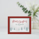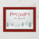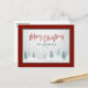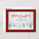 Elegant country holiday Postcards with "Merry Christmas" in red coloured, handwritten style calligraphy along with your personalised family name or names and the year in a blue spruce pine coloured, rustic style typography. An artistic scenic view of trees and winter snow highlights the front of the card accented in a pleasant, red & pine green frame.