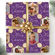 Make your holiday gifts extra special with custom photo wrapping paper! This editable template is personalised with four of your favourite photos, and the recipient's name, your family name, or the holiday year. It features hexagonal picture frames, set against a festive background of snowflakes and stars, along with the phrase "Merry Christmas". A stylish design pairing traditional typography with a classic geometric design. Perfect for photos of kids, family, friends, and pets! This seamless pattern gift wrap is available with a matte or glossy finish. Printed colours: purple, white, and a gold colour.