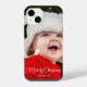 Elegant Merry Christmas photo iPhone 14 case with beautiful white cursive typography. This modern holiday family photograph phone case features gorgeous script and your custom name or text in white over the full bleed picture.