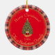 Create an unforgettable holiday display with this exquisite ceramic ornament. This beautiful ornament offers full-front photo personalisation and is surrounded by a charming tartan plaid backdrop embellished with golden dust details. The front is adorned with the timeless message "Merry Christmas," while the back showcases a vintage green fur Christmas tree, providing space for personal or family names.