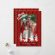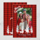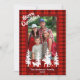 Lumberjack and wildlife theme. Red flannel in a plaid, checked pattern as background. Forest and wildlife silhouettes in white. Pine trees, moose and a fox. The text; Merry Christmas, white hand lettered script. Template for Your family photo, names and year. A greeting card for an acitve family who loves hiking, camping, nature and outdoor living.