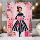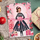 Send stylish holiday greetings with this chic card featuring a fashionable doll dressed in a beautiful holiday outfit. Surrounded by festive decorations and gifts, this card is perfect for fashion lovers who appreciate a unique and glamourous Christmas design.
