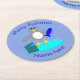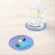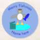 This awesome paper coaster features a cute little grey and white penguin with beady black eyes and yellow beak and feet. The penguin is holding a big blue fish with one flipper and standing on a pale blue lump of ice. There is an open present next to the penguin complete with a festive ribbon.