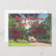 Vintage Florida driving scene with Merry Christmas from Florida in old fashioned script. Old antique post card illustration forms the background with an antique car driving through palm trees and blooming flowers for a good old fashioned holiday greeting.