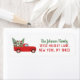 Cute illustration of three dogs riding in the back of a little red pickup truck with Christmas trees.