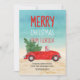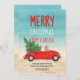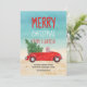 This fun Merry Christmas from Florida card is our version of the fabulous red pick-up truck snowy parts of the world are sending this holiday season. It features a red convertible -- top down, of course! -- with a Christmas tree stowed in the back seat on its way home to a very warm and tropical Christmas celebration. The typography is fun, festive, whimsical, and customisable, from top to bottom. #Christmas #Tropical #Florida || The scene is set on a tropical aqua ocean and sandy beach scene. The reverse side features the same background image, a tiny copy of the red convertible and tree, plus your family name again and the year. Make it a tropical Christmas!