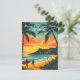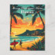 A festive postcard featuring a tropical Hawaii Christmas with surfers in Santa hats, palm trees, and a golden sunset beach scene. A fun and unique holiday greeting card.