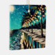 Pretty romantic coastal Ai art depicting a row of palm trees with illuminated white lights on them. A pretty reflection on the sandy beach and waves.