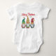 A baby one-piece suit with holiday style calligraphy reading "Merry Christmas" and your custom year or date. This fun whimsical design features a group of three colourful watercolor garden gnomes dressed for the holidays. The entire design is displayed on on both the front and the back of the suit.