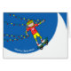 Merry Christmas greeting card with a skating / skateboard theme of a girl skateboarder, curving ramp, and Christmas lights. Bright and cheerful illustration with a sport related skateboarding theme. Art, image, and verse copyright © Shoaff Ballanger Studios.
