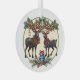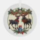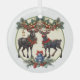 This round Christmas tree ornament is a beautiful piece of holiday decor. It is perfectly spherical and has a glossy finish that reflects the twinkling Christmas lights. The ornament is adorned with an image of two Christmas reindeers, elegantly depicted in mid-prance. They are intricately detailed, showcasing their majestic antlers and delicate features.