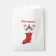 This party favour bag has a red and white stocking with a little gnome with a dark red pointy hat in the top of between two candy canes and clusters of holy leaves with red berries. The text Merry Christmas is at the top in red.