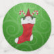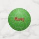 This table confetti is green with a fancy swirl pattern on all circles. The large circles have a red and white Christmas stocking with a cute gnome inside with candy canes and green holly leaves. The medium circles have the text Christmas and the small circles have the text Merry in red.