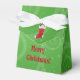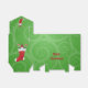 This favour or gift box is has a festive green swirl pattern with a gnome with a white beard in a red and white Christmas stocking with clusters of green holly leaves and candy canes with the text Merry Christmas in red.