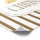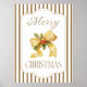 Classic holiday wall art featuring “Merry Christmas” with a golden holly bow illustration on striped gold and white background. Perfect festive print for elegant seasonal decorating.