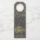 NewParkLane - Glamourous Christmas Wine Label Hanger, with a Merry Christmas wish in elegant brush/ script typography /calligraphy in faux gold, with gold confetti against a dark grey background.