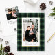 This elegant and trendy custom Merry Christmas holiday card features a portrait photo framed by a rustic chic dark green and black tartan plaid pattern with real gold foil accents. Personalize with your choice of holiday greeting, the modern family signature in script writing, the year, and choose to include more wording in the bonus space on the back of the card. A second optional bonus photo is also included on the back.
