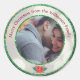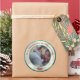 This elegant Christmas photo sticker label features a sample photograph in the centre which you can replace with a picture of your own family or other custom image. A sample Christmas greeting and family name are printed at the top. A circular frame features a faux green glitter border and bokeh style centre. A festive red poinsettia is placed at the bottom.
