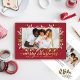 This elegant foil holiday card features a rich red background with a festive botanical frame of winter greenery and red berries. Your favorite photo is highlighted with a thin metallic foil border, and “merry christmas” shines in flowing foil script. Personalize with your family name and year for a timeless look. Backside includes a coordinating greenery sprig and custom message.