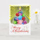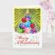 Exciting Merry Christmas greeting card design with a tree made from ornaments, a glowing yellow star, and scattered stars throughout the design. Merry Christmas written in red script lettering at the bottom of the card. Personalise or change the message inside as desired before checkout. Art, image, and verse copyright © Shoaff Ballanger Studios, 2021.