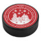 Merry Christmas Happy Holidays Winter Personalised Name Hockey Puck features the text "Merry Christmas and Happy Holidays" in modern white script on a red background and personalised with your name surrounding a home with Christmas trees and snowflakes. Perfect for Christmas party favours and Holiday gifts. Designed by ©Evco Studio www.zazzle.com/store/evcostudio